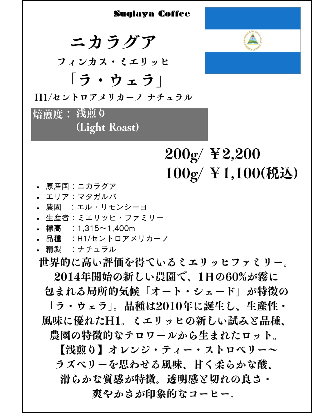 【店頭受取】ニカラグア 浅煎り フィンカス・ミエリッヒ「ラ・ウェラ」H1 ナチュラル100g