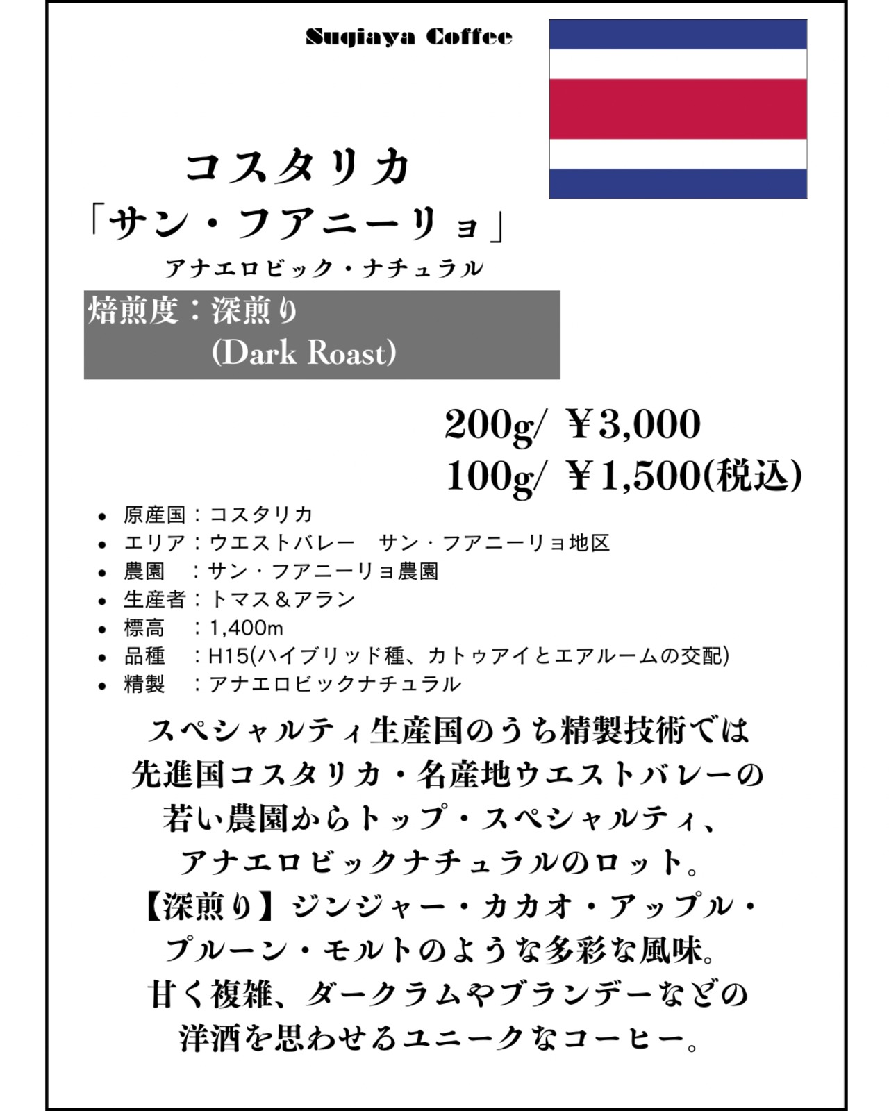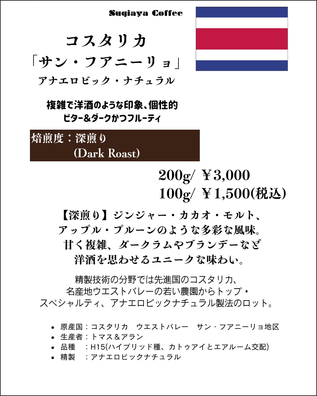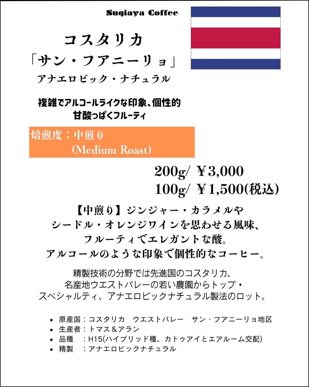 コスタリカ 中煎り/深煎り「サン・フアニーリョ」アナエロビック・ナチュラル100g