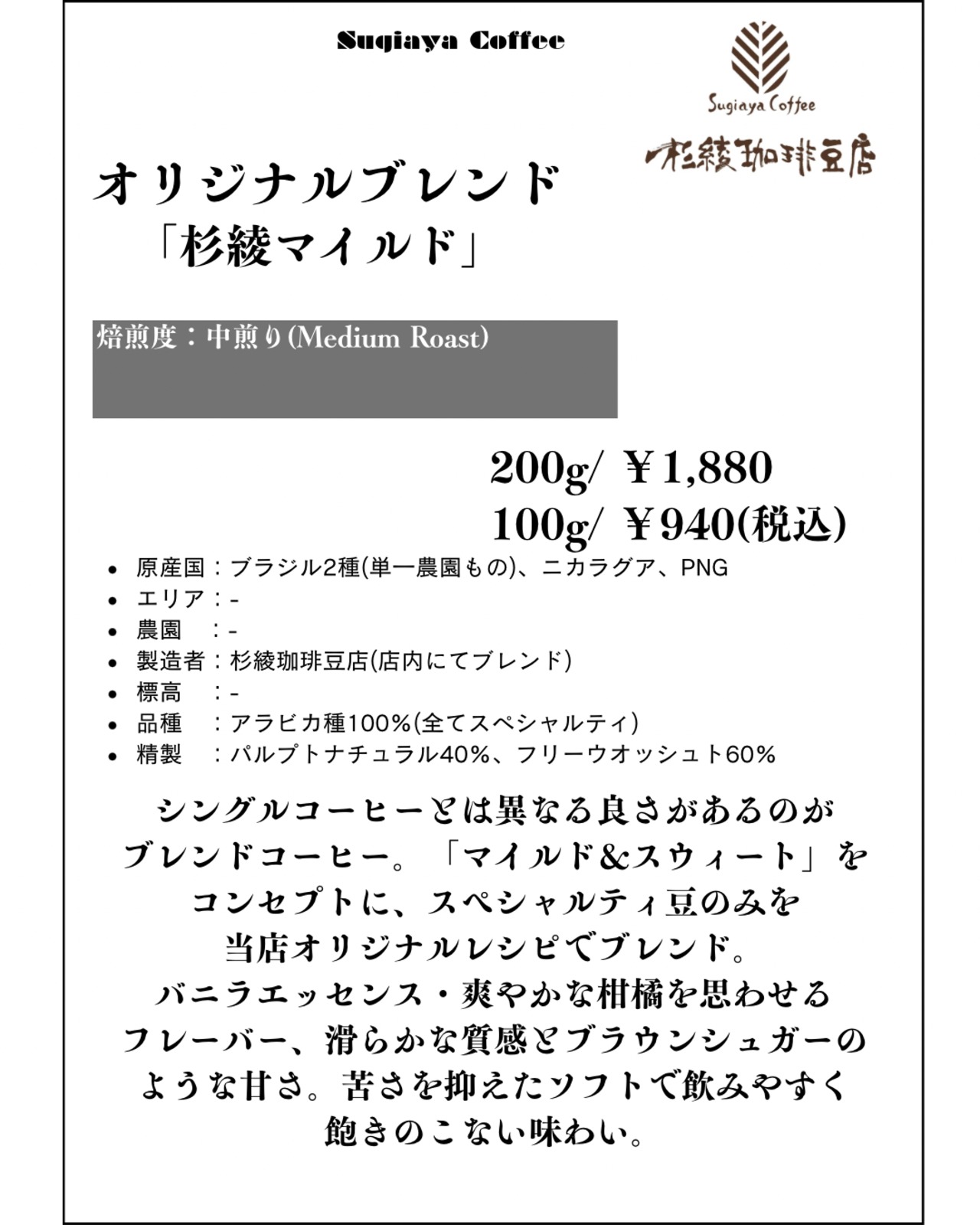 オリジナルブレンド 「杉綾マイルド」(中煎り)100g