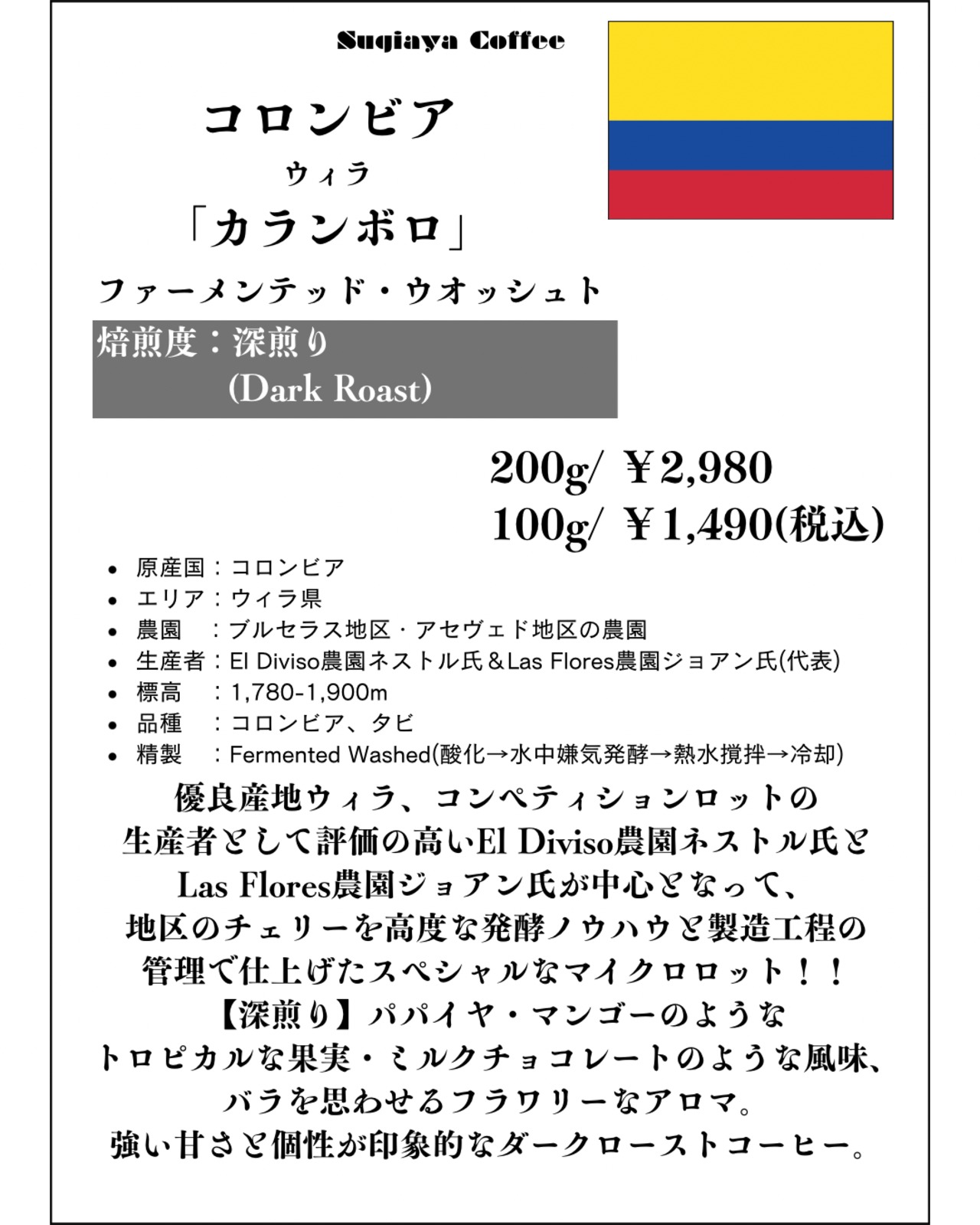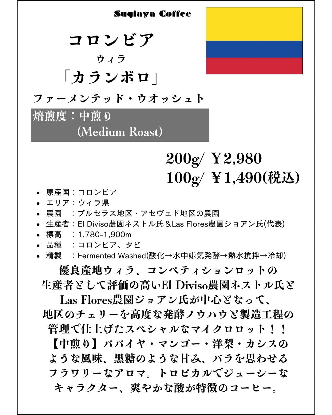 【店頭受取】コロンビア中煎り/深煎り「カランボロ」Fermented Washed100g